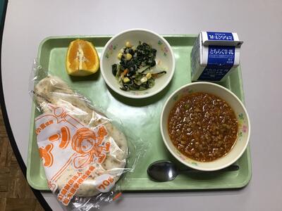 ナン、キーマカレー、ほうれんそうのサラダ、オレンジ、牛乳です。