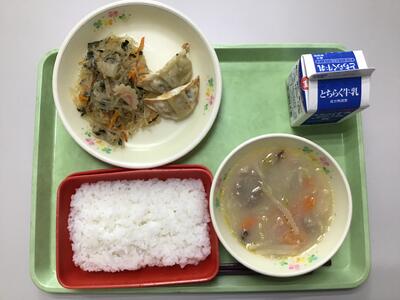 ごはん、県産豚肉ニラ入り餃子(2)、チャプチェ、ちゃんぽんスープ、牛乳です。