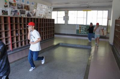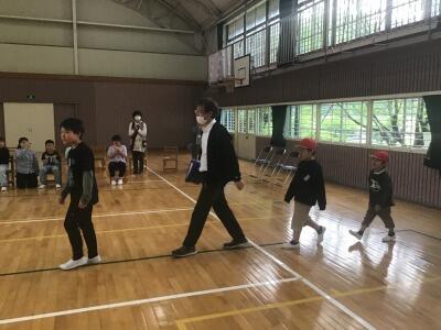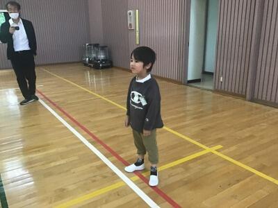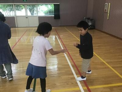 3年生以上の児童がピラミット隊形を組み、1.2年生がじゃんけんをして勝てば進むことができます。途中で負けてしまったらまた最初に戻ります。最後までたどり着くでしょうか?