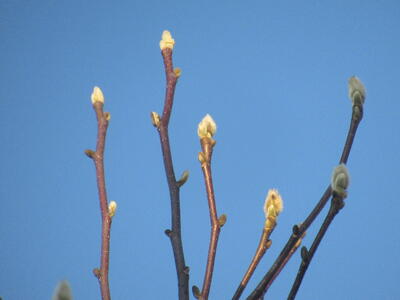 また、ランチルーム裏手にある木蓮の花芽がぐんぐん上に上に、大きく膨らんできました。菊西小の子供たちのようです。