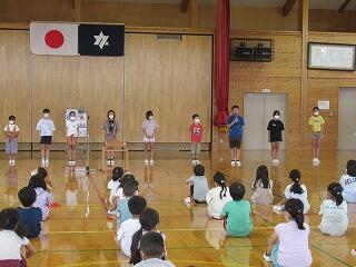 1~3年生が楽しみにしていた「まざあぐすお話会」の日がやってきました。3年生の堂々とした司会進行でお話会は進みます。スライド絵本は「ぼくだけのこと」、人形劇は「よわむしドラゴンのぼうけん」、合間には楽しい手遊びも教えていただきました。子どもたちはニコニコ笑顔です。「ぼくだけのこと」は、日本中、世界中に一人だけの僕を発見するお話です。「よわむしドラゴンのぼうけん」は、いじめられっ子のよわむしドラゴンが成長していく物語です。かわいらしいドラゴンのしぐさに、思わず「うふふっ」なんてかわいい声も聞こえてきました。とてもとても幸せな時間をいただきました。まざあぐうすの皆様、ありがとうございました。