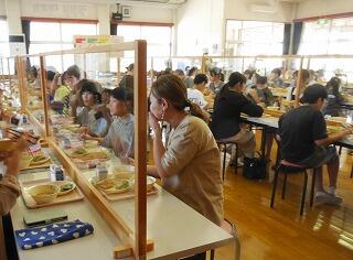 この日は、野外給食でした。きれいになった校庭や、涼しいベランダなどを選んで、縦割りのなかよし班ごとに給食を食べました。気温は高めでしたが、さわやかな風が吹いていて、いつも以上においしく感じました。