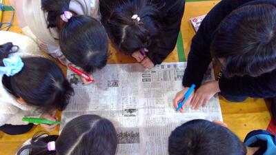 「新聞文字探し」新聞の中から、指定した文字を全員で制限時間内に見つけるゲームです。頭を突き合わせて、みんなで必死に探しました。