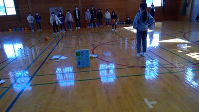 「ボーリング」ペットボトルのピンをボールで倒します。上学年と下学年でボールやスタート位置に差をつけて、一人2回ずつ投げました。ピンの大きさや重さによって点数が違うので、狙いを定めて投げました。