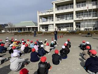 校舎内に不審者が侵入したことを想定し、避難訓練を行いました。当初11月に予定していましたが、新型コロナウイルス感染症対応のため延期して12月22日に実施しました。学校は開放的な施設ですので、どこからでも学校敷地内に入ることができます。今回は、2年生教室のベランダから侵入したことを想定し、訓練しました。児童は安全な鍵のかかる教室に素早く身を隠し、不審者が制圧されるまで避難しました。