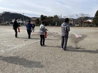 最後に、消火器の使い方を教えていただきました。そして、代表児童と職員が、訓練用の水消火器で消火体験を行いました。