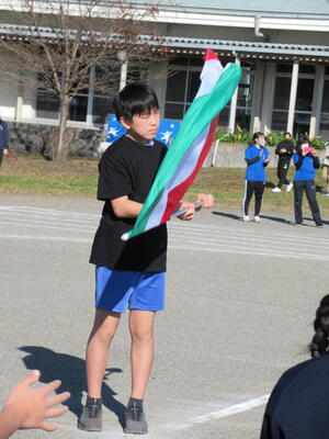 開会式。子どもたちが決めた今年のスローガンは「フェスティバル 心を一つに 楽しもう」