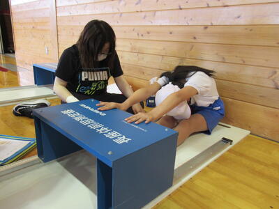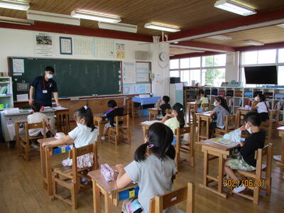 6月3日、全校児童が体力テストに挑戦しました。1・6年、2・5年、3・4年と2つの学年がグループを組んで、上学年の子どもが下学年の子どもの面倒を見ながら、はりきって6つの種目を回りました。テスト中、「すごーい」「すげえっ」「うまいっ」「はや!」「うわっ」「がんばって」の声がたくさん聞かれました。