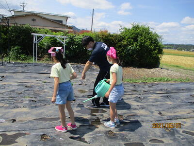 5月25日、1・2年生が希望の家の皆さんと一緒にさつまいもの苗を植えました。苗をよーく観察した後、「おいしいお芋になってね」と優しく植えました。