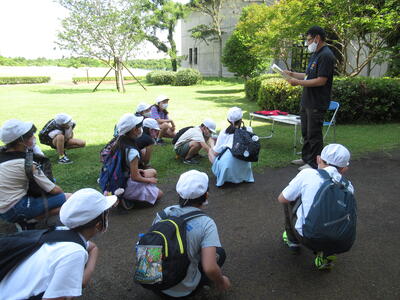砂浜活動の説明を受けます。みんな真剣な表情です。