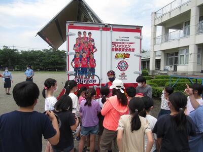 今日は、3年生から6年生の子どもたちが、ブリッツェン自転車安全教室に参加しました。本校での実施は今年で3回目、もう宇都宮ブリッツェンを知らない子どもはいません。校庭に大きなトラックが入ってくると、子どもたちはわくわくそわそわ。今年は、小嶋渓円選手が来てくださいました。子どもたち一人一人に自転車の乗り方をご指導くださり、最後は記念写真をパチリ!みんなで安全運転を誓いました。鹿沼市は、宇都宮ブリッツェンとマザータウン協定を結んだとのこと、これからもずっとご指導いただけたらうれしいです。
