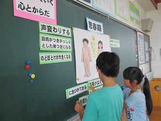 1年「体をきれいに」、 2年「おとこのこ おんなのこ」、3年「ぼく、わたしの誕生」、4年「私たちの体の成長」、5年「変わっていく心とからだ」、6年「エイズを知ろう」の学習を行いました。自分の体のよごれやすいところについて学習したり、男女の身体的な違いや特徴・生命誕生のおおよその仕組みについて学習したりしました。子ども達はカードや写真・人形などを使い、興味をもって楽しく学習に取り組んでいました。生命を大切にしようとする気持ちをもつこと、互いに認め合い、協力し合うことの大切さについて学びました。成長について男女差や個人差があることに気づき、お互いの成長を喜び合えるようになってほしいと思います。