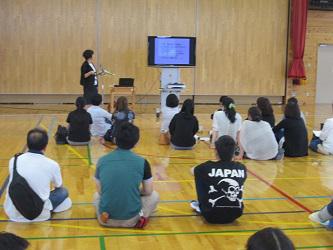 全校生で「動物園に行こうゲーム」もしました。これは友達作りのゲームです。司会の人が動物の名前を読み上げ、その文字数と同じ数の人とグループを作ります。子ども達は大きな声で歌を歌い、友達とグループを作っていました。