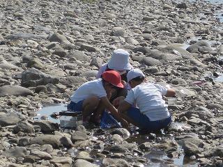ボランティアの堀田さんをお迎えし、まずは水生生物の捕り方を教わり活動開始です。暑い日に水の冷たさが気持ちよく、子どもたちは元気いっぱいに活動しました。どじょう、沢ガニ、カゲロウの幼虫、コオニヤンマのヤゴ、カワムツ、エビなどたくさんの生き物が見つかり、子どもたちは大はしゃぎでした。堀田さんからそれぞれの生き物の特徴を教わり、黒川の水が比較的きれいに保たれていることが分かりました。
