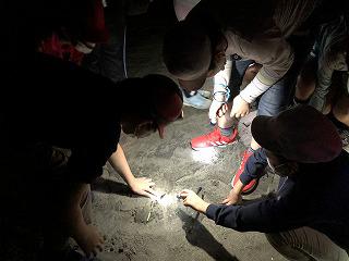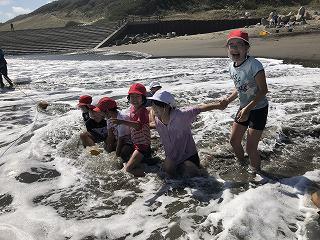 2日目。砂浜活動では、海水汲みのリレーで盛り上がり、グループで砂山を作り、最後には、波と戯れ砂だらけ。たっぷり昼食を食べた後は、ゆったりとビーチコーミング。寄せては引いていく波と遊びながら、貝殻を拾ったり、カニを見つけたり。