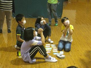 「明日は、なかよし班共遊です」の言葉に、子どもたちは「やった~」と大喜び。今回も、代表委員のみなさんが楽しいゲームを計画してくれました。始めのゲームは「木とりす」ソーシャルディスタンスに気をつけ、手をつながないで3人一組を作ります。「きこりが来るぞー」の合図で、木になった2人は別のリスを探します。「おおかみが来るぞー」の合図で、りすは別の木に動きます。「あらしがくるぞー」の合図で、みんながバラバラに。子どもたちは、3人組になるために大慌て。次は「進化じゃんけん」です。体じゃんけんで勝ったら、次のラインまで進めます。4回勝ってゴールした子は得意そう。終わってからのインタビューに、「楽しかったです」の感想ばかり。全校みんなで遊ぶ時間。子どもたちのはじける笑顔が広がります。