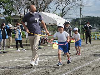 障害走では、親子で二人三脚やスキップ、デカパンなどで走ります。親子で息を合わせてゴール。子どもたちも家の人との競技で笑顔いっぱいです。