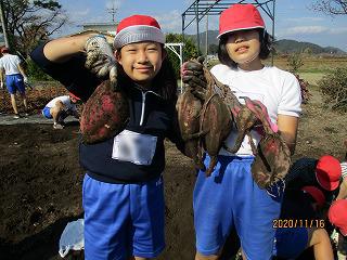 毎年、1・2年生が生活科で育てるさつまいも。今年は、コロナウイルス感染症対策のため、希望の家の方とのいもほりが難しくなり、全校生でいも掘りをすることになりました。掘ってみると、びっくり!春に植えた細い苗がいつの間にこんなに大きくなったのか、大豊作です。「こんなに大きいです」「折れないように掘るのが大変です!」など、子どもたちは、いも掘りに夢中。自分たちで掘ったさつまいも。どんなおいしいお料理になるか楽しみですね。
