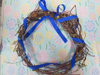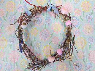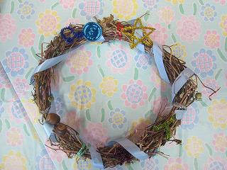 1年生が育てたあさがおのつるでリースを作りました。思い思いに飾りを付け、かわいいリースの完成です。一つ一つ作品を見ると、みんなセンスがありますね。1年生は11人。でも、作品は12こです。さて、担任の先生のリースはどれでしょうね!(ヒント・・・ピンクのハートと水色のリボン)