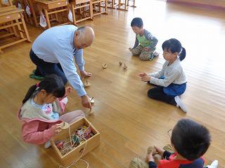 今日は3人のおじいちゃん、おばあちゃんから昔の遊びを教わる日です。3つのグループに分かれて、お手玉・あやとり・だるま落とし・紙飛行機飛ばし・めんこ・けん玉を教わりました。中には見るのも初めての遊びもあったようで、歓声がやむこともなくあっという間の1時間でした。ご協力いただきましたおじいちゃん、おばあちゃん、ありがとうございました。