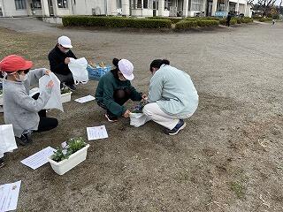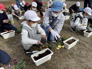 4~6年生が、今年も希望の家の方が育てられたパンジーの苗を、植え方を教えていただきながらミニプランターに植えました。花の世話を通して、植物を慈しむ心を育て、環境美化への意識を高めることがねらいです。育て方のポイントをプリントにまとめて一人一人いただいたので、それを参考にしながら家に持ち帰ったプランターを大切に育ててほしいと思います。