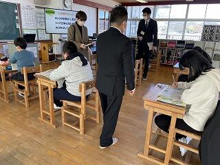 校舎内に不審者が侵入したことを想定し、避難訓練を行いました。当初11月に予定していましたが、新型コロナウイルス感染症対応のため延期して12月22日に実施しました。学校は開放的な施設ですので、どこからでも学校敷地内に入ることができます。今回は、2年生教室のベランダから侵入したことを想定し、訓練しました。児童は安全な鍵のかかる教室に素早く身を隠し、不審者が制圧されるまで避難しました。