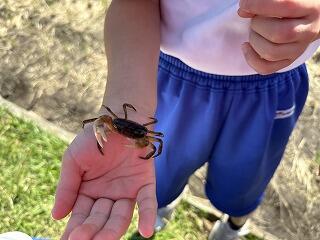 2年生は生活科「めざせ 生き物はかせ ~ぞう木林をたんけんしよう~」として、3年生は総合的な学習の時間「雑木林から地域の自然を学ぼう」として、大橋様所有の雑木林を中心に、蓮の池や用水路などで活動させていただきました。雑木林の中には、大橋様や地域の方が手作りされたすべり台やブランコなどの遊具もあります。生き物探しをした後は、柔らかな日差しが降り注ぐ中、その遊具でも遊ばせていただきました。