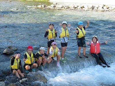 昼食を済ませて、午後は楽しみにしていた川遊び・水生生物観察です。水生生物を見つけてはセンターの先生に見せて名前を教えていただいたり、冷たい水をものともせず川遊びを楽しんだりしました。