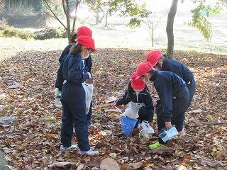 1年生が、11月22日(火)見野の大橋様の雑木林に探検に行かせていただきました。前々日の雨のため、一日延期になったので、待ちに待った探検です。生き物を捕まえたり、落ち葉のシャワーを浴びたり、のびのびと雑木林で活動させていただきました。10月に2・3年生が伺ったときよりたくさんの落ち葉があって、林の中はふかふかの落ち葉のじゅうたんを歩いているようでした。今年は、木の実があまりならなかったとのことで、事前に大橋様が別の場所にも行って集めてくださったたくさんの木の実をいただきました。本当にありがとうございました。