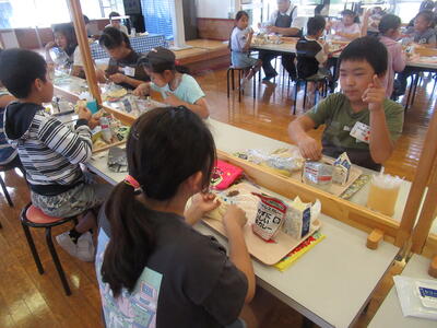 今年度も、防災給食を体験しました。メニューは「ナン、牛乳、カレー、アロエヨーグルト、バナナ」。総カロリー645Kcalの元気の出る防災給食でした。経験とは、人をなんて頼もしくするのでしょう。昨年度、すでに防災給食を経験している2年生以上の子どもたちは、躊躇することなく、パックカレーを開け、ストローなしで上手に牛乳を飲み、パクパクパクパク、実においしそうにいただきました。