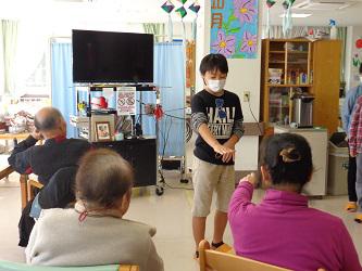 その後、2グループに分かれて、ふれあいの時間を取りました。用意してきたクイズや手品、合奏を披露しました。大喜びで拍手をしてくださる方々の様子に子ども達も本当にうれしそうでした。最後に握手をしたりお話をしたりしているうちにあっという間に帰る時間になってしまいました。名残惜しそうに手を握り続けるお年寄りもいらっしゃって、子ども達ももう少し一緒にお話をしたいとの思いでした。