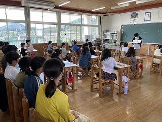 次に、1年生が一人ずつ自己紹介をしました。全員、自分の名前と、魚釣り、車、チョコバナナなど好きな物をしっかりと発表できました。