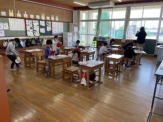 1年生もすっかり学校生活に慣れてきました。朝は、6年生が1年生教室に来て、荷物の片付け方を教えてくれたり、名札をつけてくれたりしています。