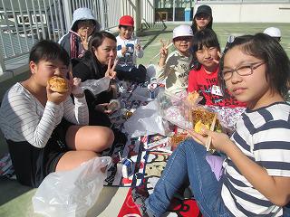お天気になったよ!おいしいね 投稿日時 : 2018/10/24 校長 朝は、雨が残っていましたが、お昼にはすっかり天気もよくなり、暑いくらいでした。今日は、野外給食。いつものランチルームから飛び出し、校庭や芝生のベンチ、3階ベランダなどで給食です。焼きそばやハムチーズパン、オムレツ、ブロッコリーなどおいしいメニューに、子どもたちも大喜び。なかよし班で集まり野外給食を楽しみました。
