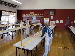 食後も活動は続きます。ランチルームの清掃です。実に手早く、きれいにできます。ごみは、みんなが小さくまとめて出してくれるので、とても助かります。職員も一緒に、テーブルの消毒作業をします。