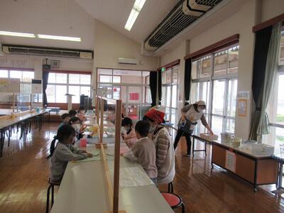 4月13日、1年生にとっては記念すべき初めての給食です。担任の先生と、一つ一つ確認しながら給食の準備を進めます。子どもたちは大張り切り。ランチマットを用意して、手を洗って、一列に並んで、いざ、ランチルームへ。この日のメニューは「大麦ご飯、牛乳、ポークカレー、こんにゃくサラダ」と、子どもたちに人気のメニューです。「うわーっ」「ふふふっ」「おーっ」「おいしいです」あっという間に、おいしい顔がいっぱいになりました。