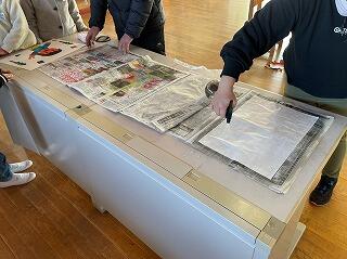 3年生が、紙版画を刷りました。版画用紙を霧吹きで濡らしてから、台紙にのせて刷ります。カラフルな色合いが、版画用紙にきれいに写し出されて、楽しいです。