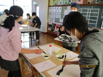 6年生が図工の時間に一筆龍の体験学習を行いました。一筆龍とは、古来より縁起物として知られる龍の胴体を一筆で描く伝統の技で、講師は、晄秋家 阿部様ご夫妻が快くお引き受けくださいました。まずは、先生の素晴らしい作品に息をのみ、見事な実演にうっとりして拍手、それからいよいよ体験です。一人一人が真剣そのもの!自分だけの龍の作品づくりに挑戦しました。阿部先生、素敵なドキドキ感動体験をありがとうございました。