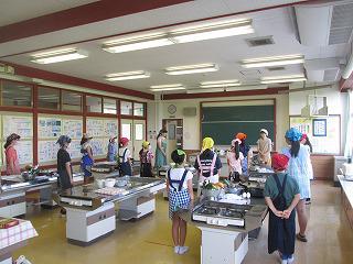 サマースクール<上学年向け料理教室> 投稿日時 : 2019/07/27 校長 今日は、サマースクールで4~6年生の料理教室がありました。黒川幸子先生をお招きし、「ケークサレ・トマトとレタスのスープ・フルーツヨーグルト」を教えていただきました。グループで、食材を切ったり、炒めたり、焼いたり。みんなでわいわい楽しく作りました。ケークサレには、パプリカ、玉ねぎ、ほうれん草、コーン、ウインナー、チーズ、卵、牛乳が入ります。生地はホットケーキミックス。ホットケーキミックスを使って、こんなに栄養満点の色とりどり鮮やかでおいしいお料理ができるんですね。夏休みにおうちの人と、また作ってみてください。