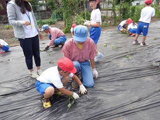 サツマイモ植え 投稿日時 : 2018/06/05 校長 5月29日に希望の家のみなさんにお手伝いいただき、1・2年生がサツマイモの苗を植えました。希望の家のみなさんが、子どもたちに丁寧に教えてくださり、あっという間に植え終わりました。初めのうちは戸惑っていた子どもたちも作業が終わる頃にはすっかり打ち解け、楽しそうにおしゃべりする姿も見られました。その後、子どもたちは水やりなどの世話を毎日行っています。今から収穫が楽しみです。