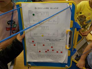 生活科の学習で、1年生が2年生に引き連れられて、校舎の中を探検しました。「失礼します。学校探検に来ました」元気のよいあいさつで、子どもたちは職員室に入ってきました。「ここは先生たちがお仕事をする部屋です。」職員室に入ると、2年生が1年生に説明をします。なぜか子どもたちは室内をきょろきょろ。部屋のどこかに暗号が隠されています。職員室に隠されていた文字は「ど」校長室には「ょ」でした。全部の部屋を回ると「めざせあいどる!きくにししょう」になるのだそうです。