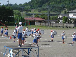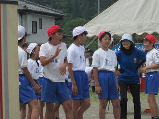 応援団の子どもたちが練習に取り組んでいる頃、下学年の子どもたちはクラスでまとまって遊ぶ共遊の時間でした。こちらもクラスのまとまりを作る上でとても大切な時間です。担任の先生と一緒に楽しく遊ぶ姿が見られました。