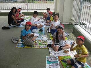 17日(木)に、なかよし班での野外給食がありました。メニューは、焼きそば・つきみスコッチエッグ・ミニトマト・豆乳蒸しケーキ・牛乳でした。いつもとは違うメンバーで、ベランダやイチョウの木の下など外で食べる給食はなぜかいつもとはひと味違っていました。運動会の練習で忙しい時期に、楽しくほっとする時間でした。