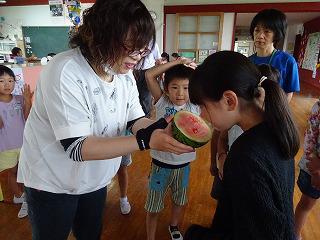 このすいかあじがうすいかも 投稿日時 : 2018/07/06 校長 1・2年生の育てたスイカがいい大きさになってきました。そこで、一つだけ試しにとってみることになりました。すいかを前に子どもたちは興奮状態です。全員がカウントダウンで見守る前ですいかが二つに切り分けられると大きな歓声が上がりました。その後、一口サイズにきれいに切り分けられたすいかが子どもたちの前に並びます。子どもたちはしっかり味わいながら食べています。「甘い。甘い。」「おいしいね。」子どもたちの感想です。職員室にもお裾分けが届きました。色がほんのりピンク色のすいかに「このすいかあじがうすいかも。」なんて声もありましたが、どうしてどうして、あじもしっかりしており、甘さもしっかりありました。農園にはまだたくさんのすいかが実っています。来週あたりが食べ頃でしょうか。休み時間に農園のすいかを指さし、話し合っている子どもたちの姿が見られました。