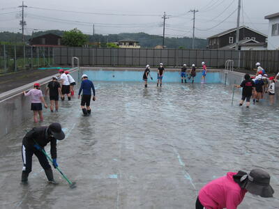 今年度は、新型コロナウイルス感染症対策を万全に講じてプール授業を行います。まず必要なのが2年ぶりのプール清掃です。プールの底に危険物が沈んでいるといけないので、まずは職員が頑張りました。体育主任が前処理をよくしておいてくれたおかげで作業は思ったよりもスムーズでしたが、それでも中は、ヌルヌルのドロドロのブジョブジョでした。仕上げの清掃は、5・6年生が全員で頑張りました。パワー全開!濡れることなど気にする様子もなく、半分楽しみながら、見事に仕上げました。さあ、次は機械の点検です。プール開きに向けて、着々と準備を進めています。