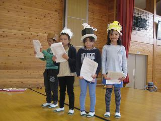 すてきなぼうしをください 投稿日時 : 2018/10/15 校長 今日から、学習発表会の練習がステージで行われるようになりました。写真は、2年生の劇「わたしたちのすてきなぼうし」です。まだ台本を見ながらの練習ですが、大きな声を出して一生懸命頑張っています。どんなすてきなぼうしが出てくるか楽しみです。
