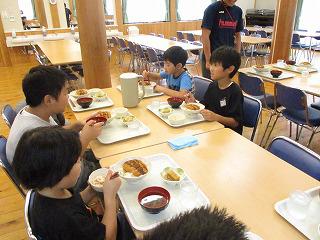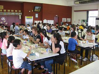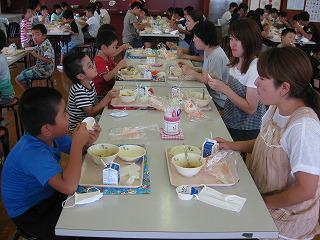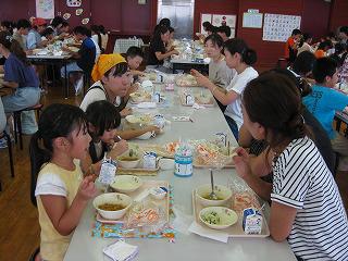 最後はお待ちかねの給食。メニューは、ナン、キーマカレー、マカロニサラダ、ゼリー、牛乳でした。おうちの人と一緒に食べる給食は、いちだんとおいしく感じました。