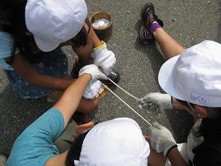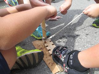 4年生 自然体験学習 part8 投稿日時 : 2018/09/04 校長 「やっぱり無理ですね」「今回はライターの火を使うということで」「分かりました終わりにしましょう」そんな会話がセンター職員の方たちの中で行われ始めたまさにその時、「つきました」「やったー」「できた」のさけび声が。1班のろうそくに灯がともりました。残りの二班もなんとか付けたいというまるで何かにとりつかれたかのように一心不乱にロープを回します。「もう腕が痛くて動かない」そんな声が聞こえる中で無情にもタイムアップの時間が。子どもたちは本当によく頑張りました。結局1時間以上火起こしに挑戦しましたが、火がつかなかったグループもありました。でも一本のろうそくの灯がピザ釜にうつされ、赤々と燃え上がりました。この後は、ピザつくりです。