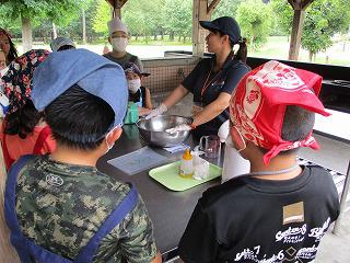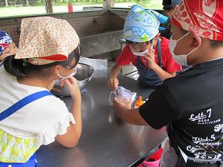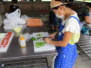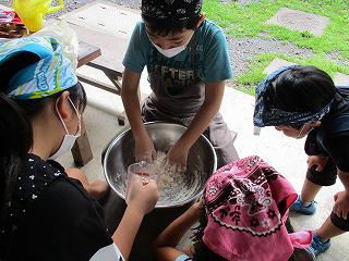 4年生 自然体験学習 part9 投稿日時 : 2018/09/04 校長 センターの大橋先生のお料理教室が始まりました。小麦粉に塩・イースト菌・砂糖を溶いたぬるま湯を加えて練り上げていきます。みみたぶくらいの柔らかさ目指して、ひたすらこねていきます。時折自分の耳たぶを確認しながら、こねること20分ほどでいい柔らかさに。発行を待っている間に、具材の準備。野菜やコーン・チーズなどを切り分けていきます。片付けも同時に行う手際のよさ。発酵が終わったたねを5等分し、それぞれアルミホイルにオリーブオイルを塗った上にきじを伸ばします。「トマトはちょっと」「ピーマンは無理です」「まぁ、そう言わないで。少しだけね」のひと言にあきらめて全ての具材を並べていきます。できあがったグループからかまどで焼いてもらいます。子ども曰く、星野プロの焼いたピザは最高ということでおいしいピザが焼き上がりました。「トマトも食べられる」「ピーマンもっと入れてもよかった」苦手な食材もおいしく食べられたようです。黙々と食べ全てを平らげた子どもたちの表情がそのおいしさを表しています。