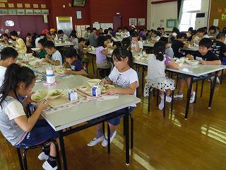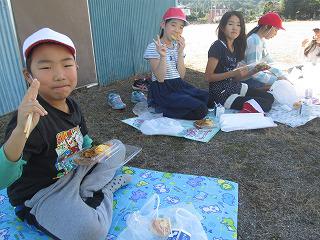 お天気になったよ!おいしいね 投稿日時 : 2018/10/24 校長 朝は、雨が残っていましたが、お昼にはすっかり天気もよくなり、暑いくらいでした。今日は、野外給食。いつものランチルームから飛び出し、校庭や芝生のベンチ、3階ベランダなどで給食です。焼きそばやハムチーズパン、オムレツ、ブロッコリーなどおいしいメニューに、子どもたちも大喜び。なかよし班で集まり野外給食を楽しみました。